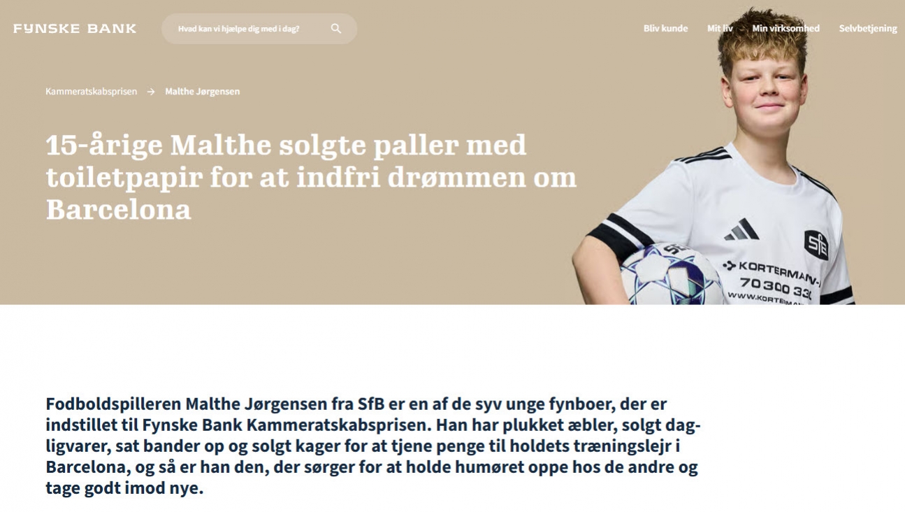 MALTHE JØRGENSEN FRA U16 ER INDSTILLET TIL KAMMERATSKABSPRISENMalthe Jørgensen fra vores U16-årgang (årg. 2010) er sammen med seks andre unge fynboer indstillet til Fynske Banks Kammeratskabspris 2025. Malthes holdkammerater har peget på ham, fordi han bidrager positivt til kulturen på holdet. Han bliver beskrevet som en spiller, der spreder god energi, tager godt imod nye ansigter og formår at samle holdet på tværs af både sociale og sportslige skel. For Malthe er fællesskabet vigtigt – både på og uden for banen. Prisen uddeles lørdag den 17. januar i forbindelse med Fynske Bank Sportslørdag i Odense Idrætspark. En gruppe af holdkammeraterne og trænerne tager med til Odense for at heppe og støtte Malthe ved prisoverrækkelsen. Via linket herunder kan du læse mere om indstillingen af Malthe, og hvad præmien skal gå til, hvis han bliver kåret som årets kammerat: Læs om indstillingen af Malthe her: Vi hepper på Malthe og ønsker ham og holdet en god dag i Odense på lørdag. Uanset om Malthe vinder prisen eller ej, så er han allerede en vinder hos os, da han i den grad viser flaget for, hvad en rigtig kammerat og holdspiller står for. |